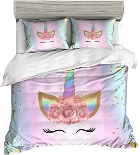 KIACIYA Housse de Couette Licorne Fille 135x200 cm Parure de Lit Licorne Enfant Motif 3D Housse Couette avec Fermeture Éclair- Sets de Housse Couette avec 2 Taies d'oreiller (7,135x200cm)